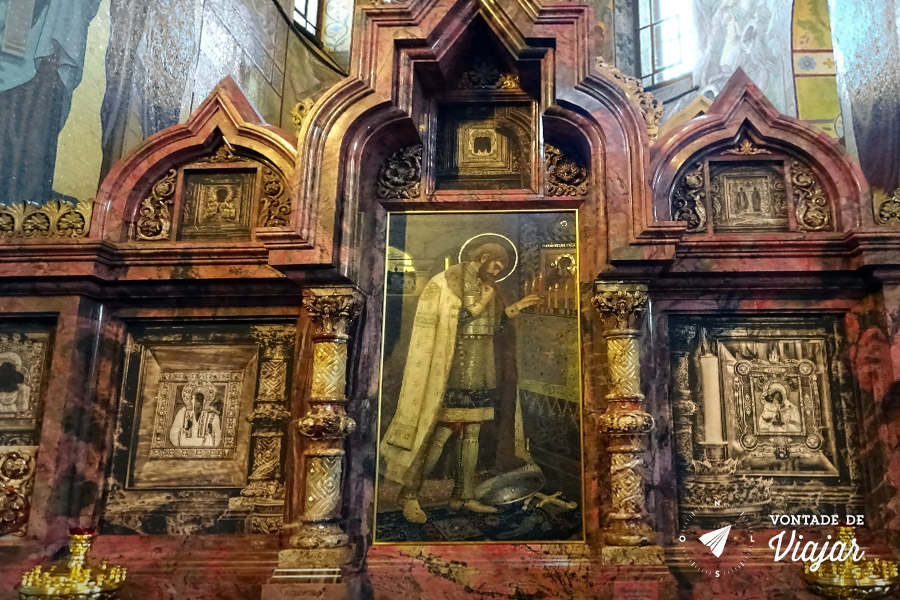 Igrejas tradicionais russas não têm escultura. O interior é todo decorado de mosaicos. Hoje em dia é mais museu que igreja, pelo patrimônio arquitetônico. Tem mais de 7 mil metros quadrados de alguns dos mais lindos exemplares do mosaico típico da Rússia, que usa pedaços de pedras semipreciosas de diferentes cores, em vez de usar cerâmica pintada (consegue imaginar o valor disso?).
