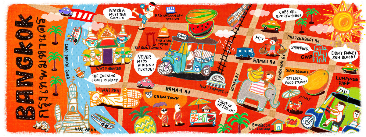 A capital da Tailândia também está entre os mapas do site They Draw and Travel! Na ilustração de Aunyarat Watanabe, ganham destaque os templos Wat Pho e Wat Arun, além dos incontáveis taxis e tuk-tuks que agitam Bangkok.
