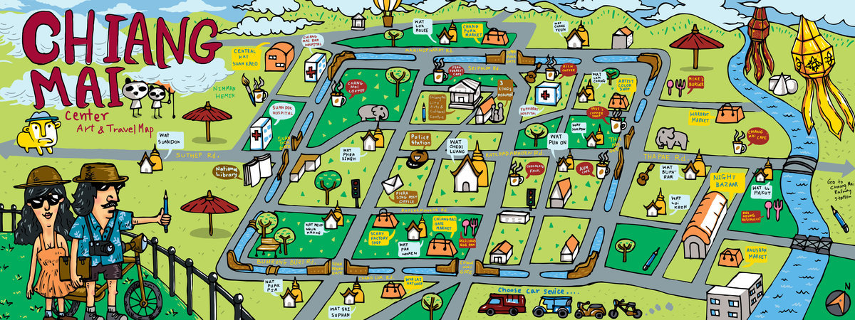 O centro histórico de Chiang Mai, no norte tailandês, foi desenhado por Chaloempon Khuankhong, que aponta os principais entre os mais de 300 templos da cidade e mostra também o imperdível Night Baazar, mercado que atrai centenas de pessoas todas as noites.