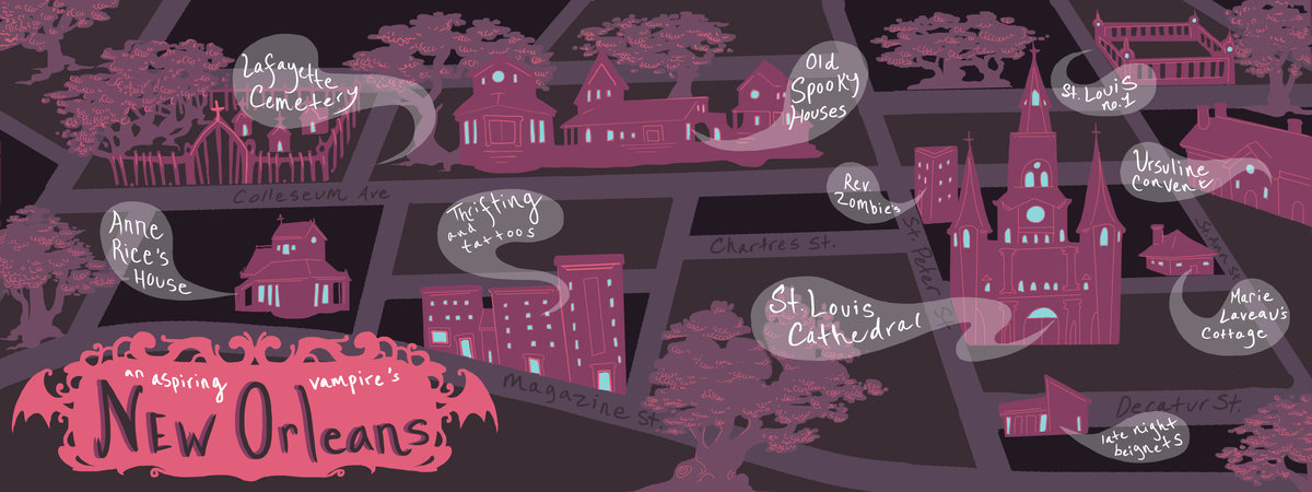 Jayne Steiger optou por um mapa temático de Nova Orleans para quem curte histórias de vampiros. As crônicas e livros da escritora Anne Rice, nos levam por um passeio pelos locais que serviram de cenário para suas histórias, como a Catedral de St. Louis e o cemitério Lafayette. Vale assistir o filme Entrevista com o Vampiro de novo para refrescar a memória antes de começar o roteiro.