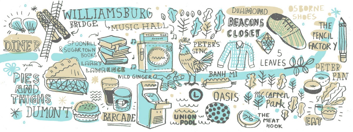 Um dos bairros mais divertidos de Nova York, Williamsburg foi ilustrado por James Gulliver Hancock. Não ficaram de fora os bares Union Pool (que o Matheus já tinha indicado pra gente nesse post aqui) e o Barcade (que faz parte do nosso roteiro geek em NY).