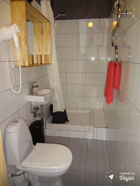 Ficamos numa suíte com cama confortável e um banheiro bem limpinho, além de um sofá e um cabideiro que ajudam a organizar as coisas.