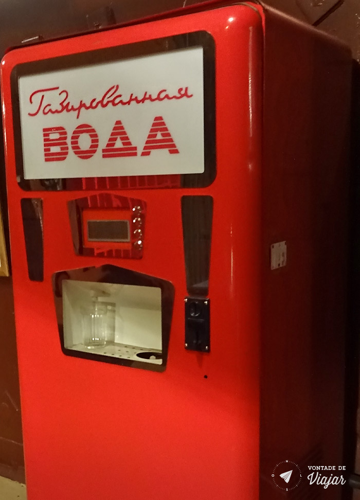 Uma das mais típicas é a máquina de refrigerante, muito característica do período soviético. Em vez de copos descartáveis ou latinhas, a soda era servida num copo de acrílico, que você deixava na máquina para a próxima pessoa passar uma água e usar também… rs