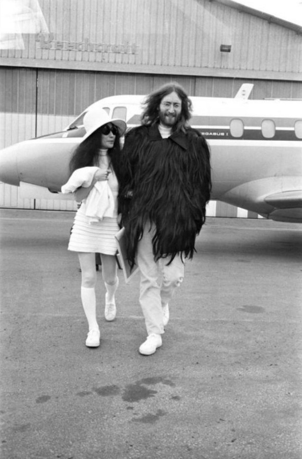 Yoko, sempre longe do convencional, dispensou vestido e casou de mini-saia com meias até o joelho e tênis. Dizem que os óculos escuros dela eram assinados pela Vivienne Westwood, estilista que mais adiante definiu a moda do movimento punk londrino.