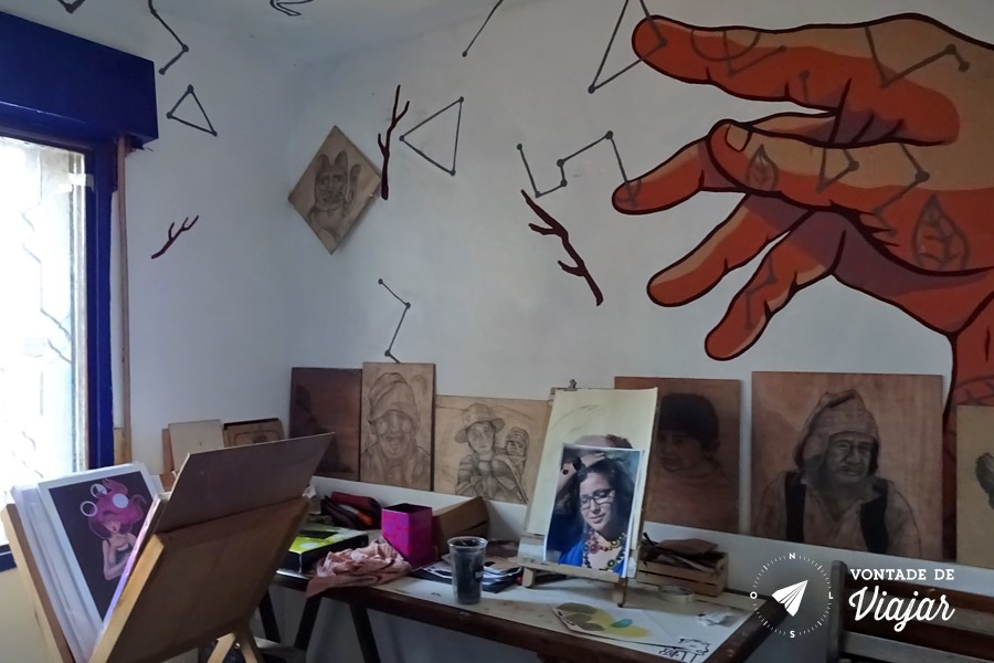 Em cada cômodo, cavaletes, mesas e telas se alternam com desenhos pendurados na parede e murais pintados não só por eles, como por amigos de outros países que vêm visitar.